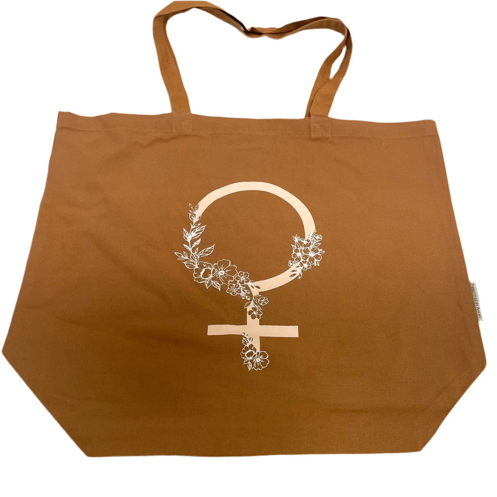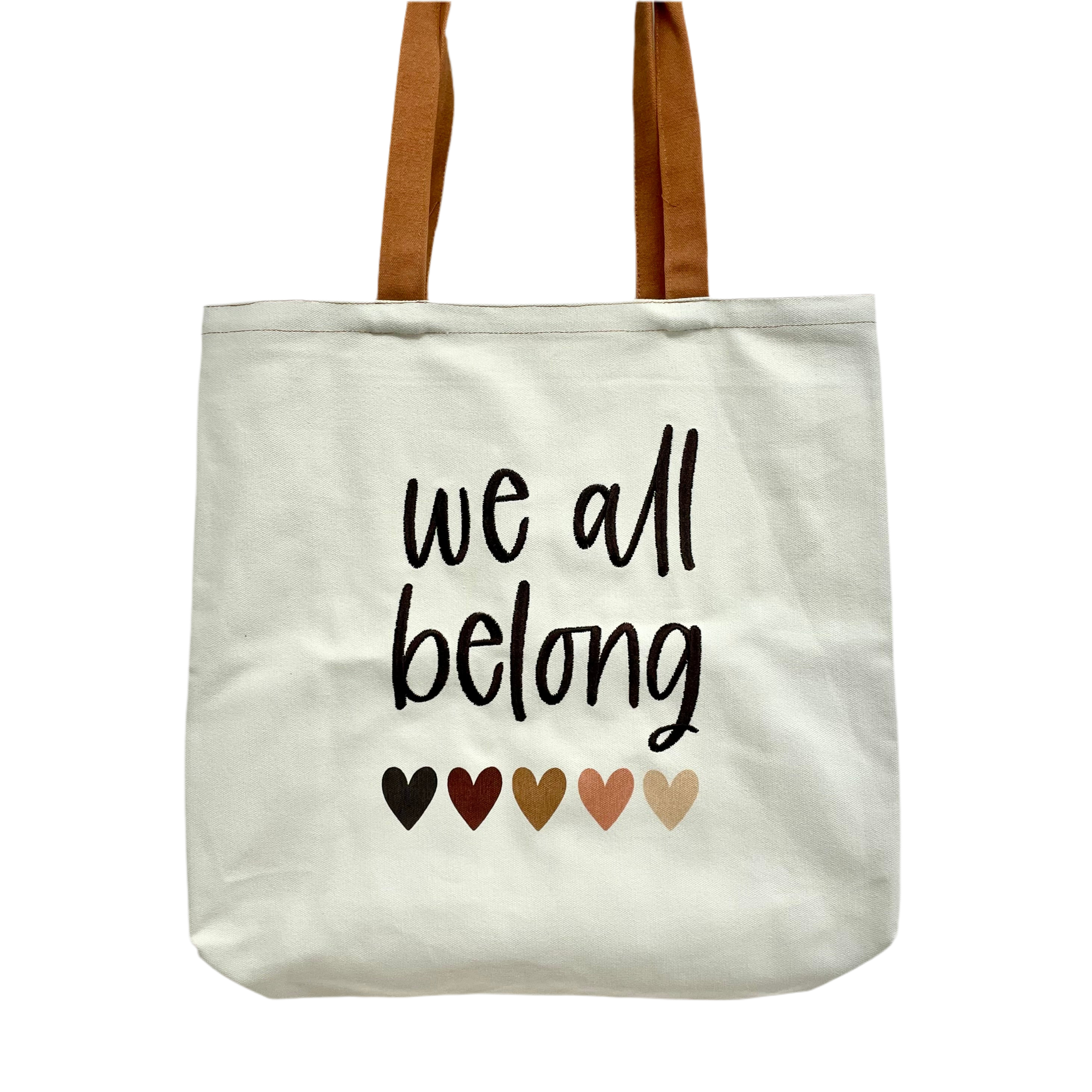 Medium weight canvas tote with "We All Belong" embroidered on each side.