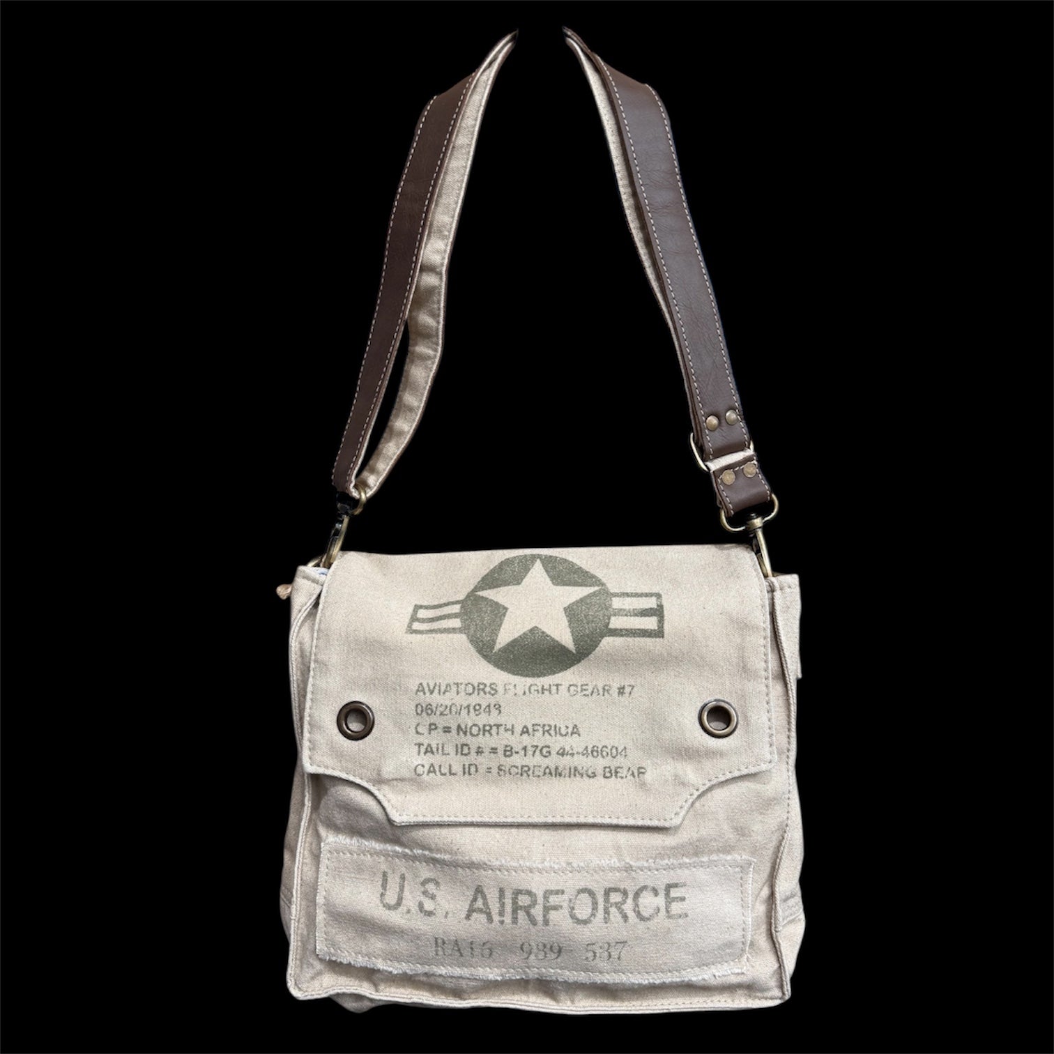 Crafted from reclaimed military canvas and tent materials, this U.S. Air Force Flight Gear Shoulder Bag honors the resourcefulness of those who serve. The durable construction gives new purpose to authentic military textiles, making it a meaningful accessory that celebrates Air Force heritage while supporting quality craftsmanship.