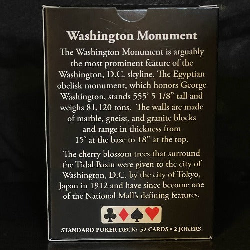 Shuffle up some springtime charm with this delightful deck featuring Washington D.C.'s most enchanting season! Watch the Washington Monument stand tall while gorgeous cherry blossoms frame the scenic Tidal Basin on every card. Whether you're hosting game night or just admiring the artwork, these cards bring a splash of D.C.'s famous floral beauty to your table.