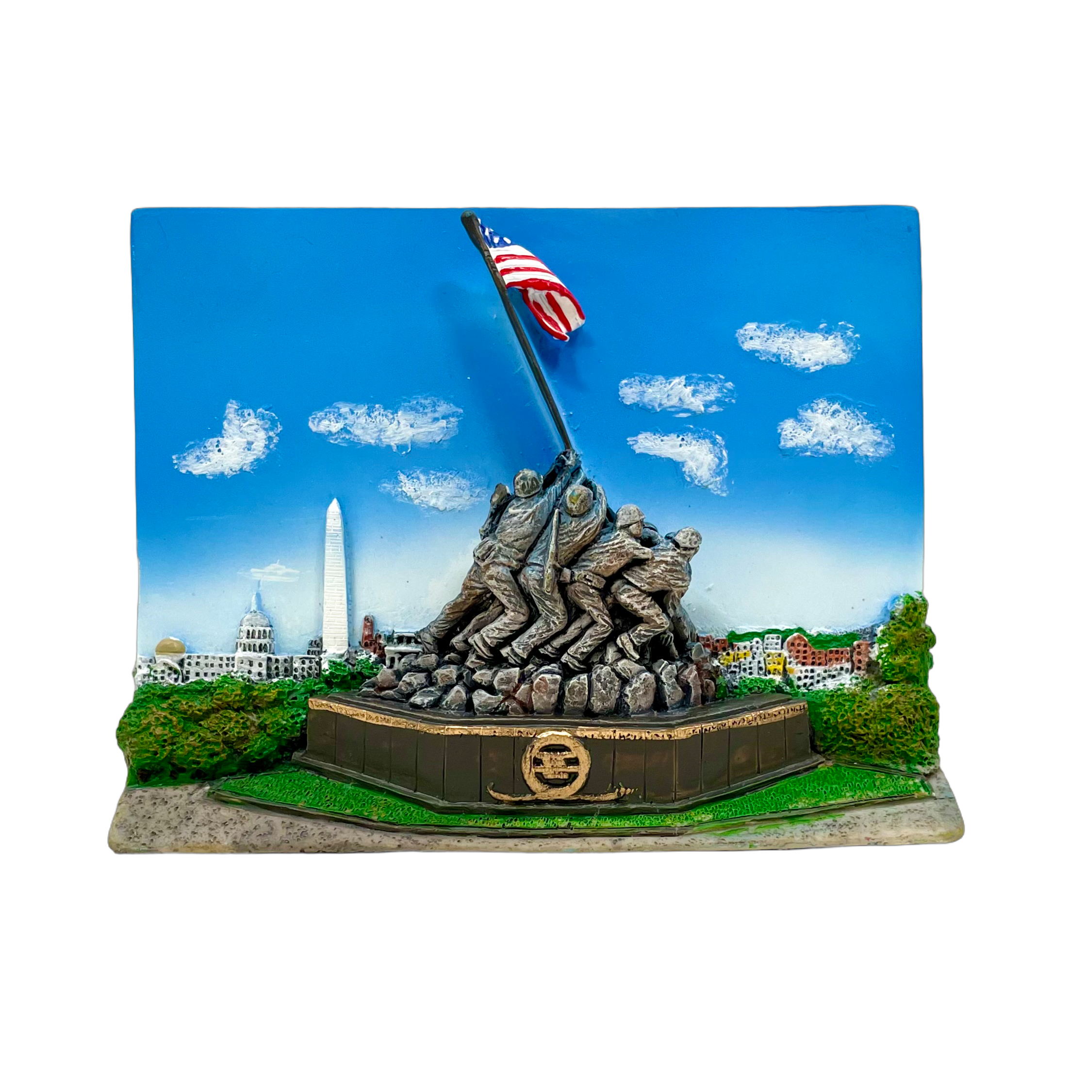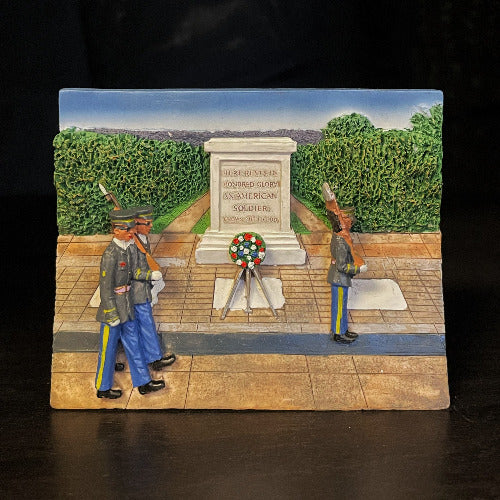 These polyresin refrigerator magnets showcase two revered military landmarks with impressive three-dimensional detail. Choose between the dignified Tomb of the Unknown Soldier guarded by Arlington's sentinels, or the iconic moment of Marines raising the American flag depicted at the Marine Corps War Memorial. Perfect for displaying pride in military service, each magnet captures the depth and significance of these enduring symbols of courage and sacrifice.